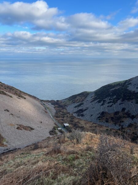 The view back towards Lynton and Lynmouth couldn’t be more stunning – blue sky with puffy clouds melding into the horizon over the still sea. The valley just past Foreland Point, known as Coddow Combe is mostly shale with pockets of low lying flora. We can see a car parked beside a modern looking wooden clad single storey hut nestled in the valley below us, a tarmacked road lead out to the lighthouse, just out of sight.