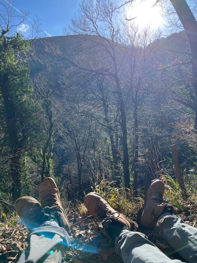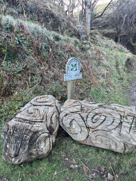 The path takes us well away from the coast through the woodlands around Home Farm. It’s a well-trodden path but at times there are signs of small landslides with many fallen trees now blanketed with moss and ferns and fast flowing water gushing through. We are wrapped up warm despite the sunshine, which is not quite reaching us on the side of the cliff but shining on the gorse and hills around us. Although we do find a spot in the woodland where we flop on the path for a picnic, the sun shining through the trees onto us.