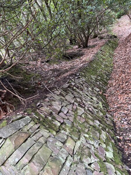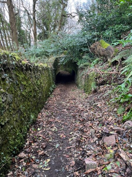 We follow a stone wall to where “Tunnels” are marked on the map. We are below the site of Ashley Combe, the summer residence of Ava Lovelace and her husband William King. According to this website (Ada Lovelace – Dovery Manor Museum) “William brought in conifers from his own Scottish estate and imported species plants and trees from around the world, to add to the native oaks and beech trees, to create what has been described as one of the first designed arboretums in England” . This explains the trees I discovered earlier on. Why the tunnels? Well they were built for tradesman to access the property and not disturb Ava and her family whilst holidaying at Ashley Combe. They are now fenced off, with ivy and tree saplings creepingin and trees toppling over the walls.