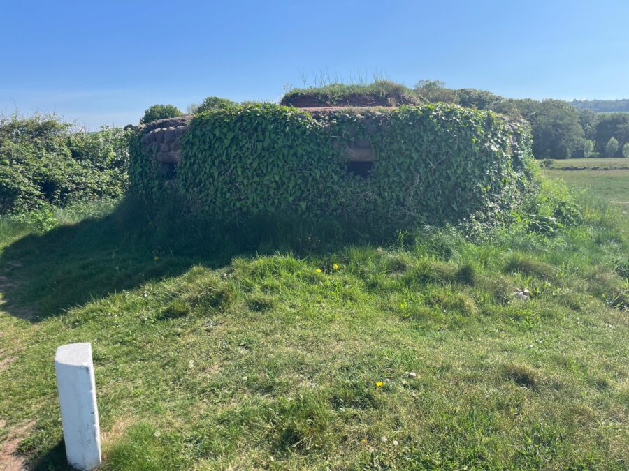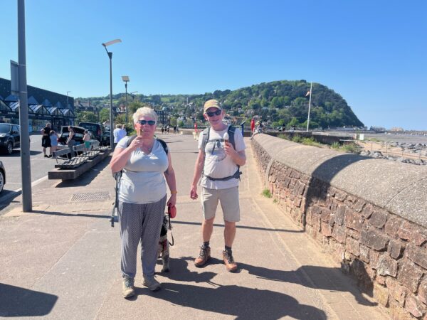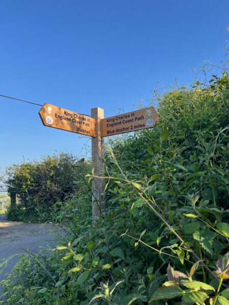 A grassy field devoid of a castle turns out to be the hill fort site of Daw’s Castle – it was certainly an impressive view looking east and up the Bristol Channel. Here we find our first, brand spanking new, fingerpost saying King Charles III England Coast Path. Onto a stretch of road, with no need to worry about cars, as it has been indefinitely closed to traffic due to cliff erosion.  We weave around massive concrete bollards and heras fencing into Watchett.