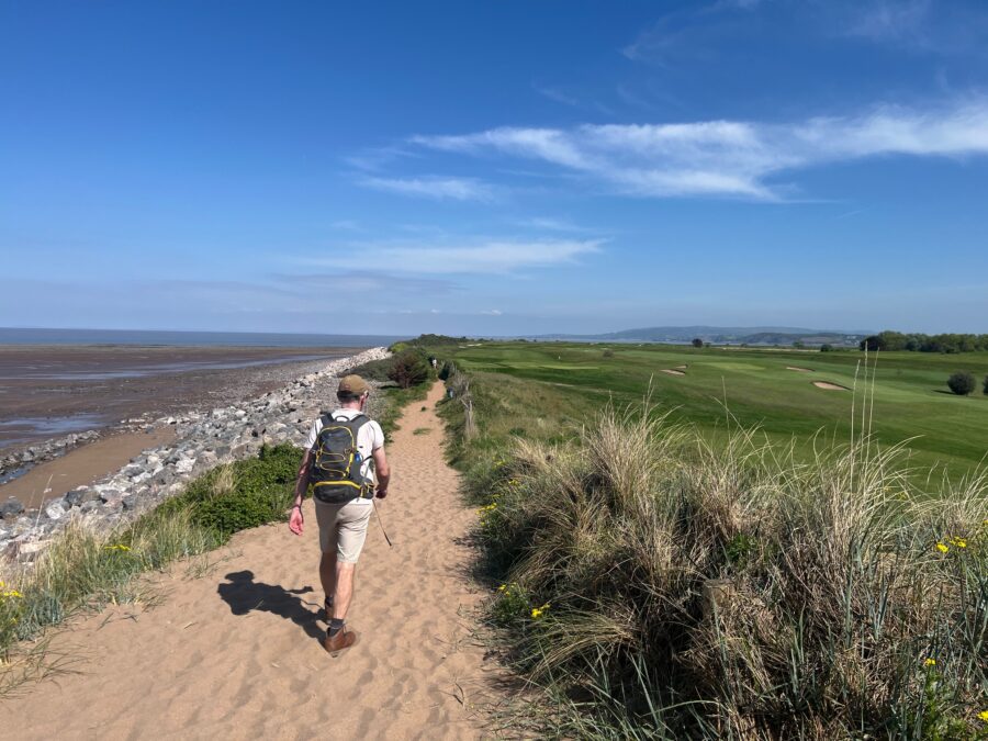At the end of the prom we take the short but steep climb up a sandy pathway to the edge of the Minehead and West Somerset golf course.  We duck and cover our heads when necessary. Looking across the Bristol Channel to where we imagine Gavin and Stacey are riding the log flumes on Barry Island.