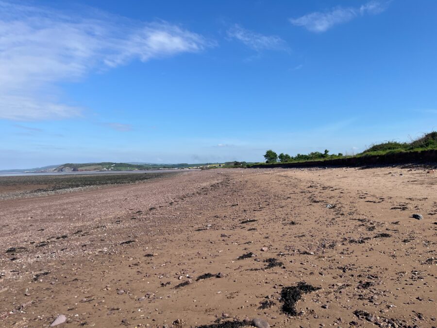 The sandy path turns to gravel, now bordered by the grey leaves and spiky stems of sea buckthorn, the orange fruit yet to form. Then a pill box marks the end of the golf course and we arrive at Dunster beach with its array of holiday lodges.  We are pleased of the shade of the pine trees around the Kingfisher Kiosk – its seems early in the season to be looking for sun shelter.  Stop for a fruit break.  Looking inland we can just about make out Dunster Castle perched on a wooded mound. Outside one lodge a man is bizarrely moving barrow loads of sand from his garden to the beach?