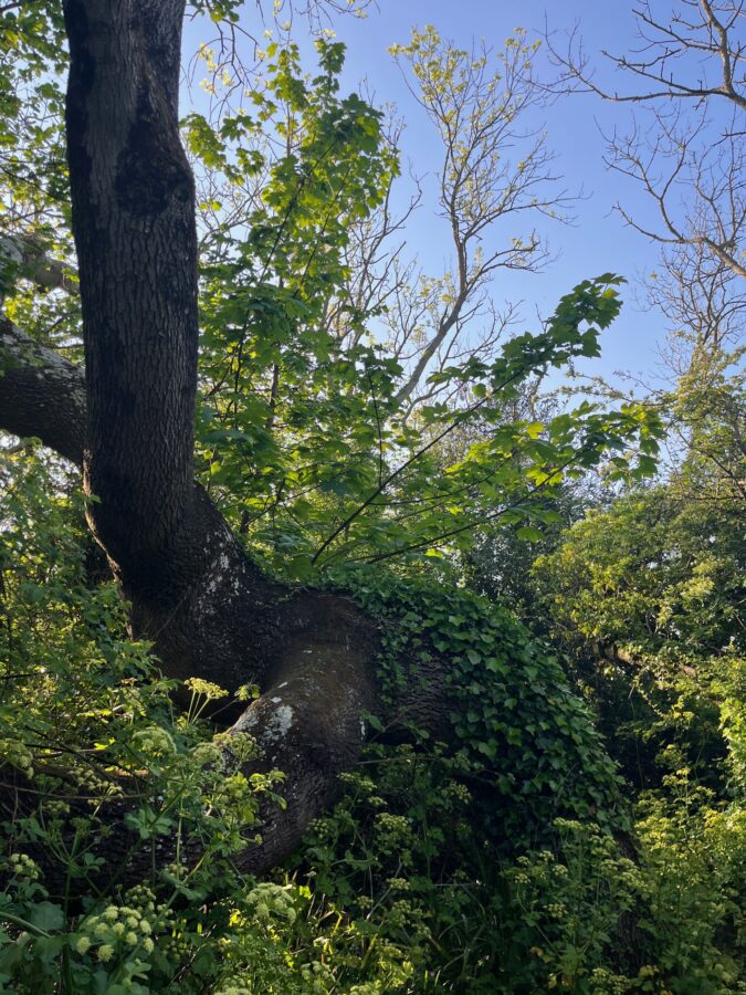 I stop to admire the impressive bend of an ancient oak, its leaves and complex twig structure illuminated architecturally against the blue sky. We get a brief view over the sea and mud flats, round the edge of a mowed field then back into woodlands.  This time the hazels in desperate need of coppicing.