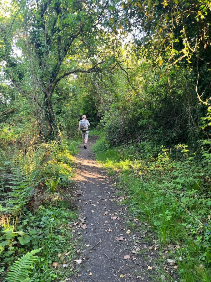 Leaving Heather to journey back in the campervan we leave Blue Anchor behind and take the path from the road to the cliff top.  The sun is shimmering on the sea, now at low tide as we look back over Blue Anchor towards the hills in distance – Bossington Hill? Cross the field and delve into Cridland’s Copse.  It feels comforting to be surrounded by trees – coppiced hazels, flowering hawthorns, creeping ivy and brambles and ferns unfurling in the dappled sunlight.  Wood pigeons are coo-ing, robins tweeting and the trees buzzing with insects, butterflies emerging – bliss.