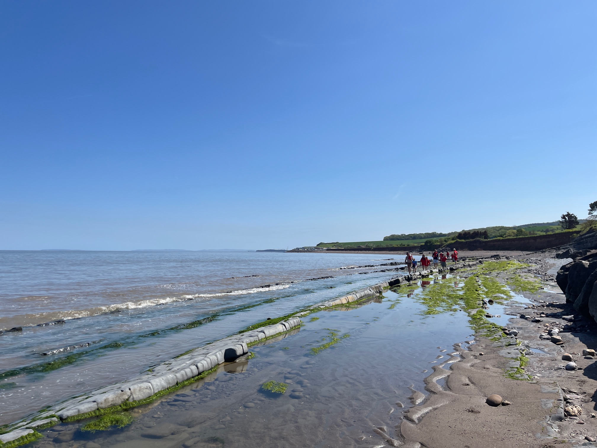 The natural rock formations lying at an angle on the beach remind me of the stacks at the Giant’s Causeway. We follow them along until we hit our first hurdle – a concrete breakwater sticking out to sea. It takes for 4 climbers and 3 dogs to climb onto and over the top on the massive “ankle breaking” boulders. I can’t decide whether to take off my boots and lower myself into the sea or clamber, but it turns into an elegant scramble with Freddy the dog being the last to decide on his route. We soon pass a large group of young children and adults – I bet they’re not as whiny and indecisive as us!
