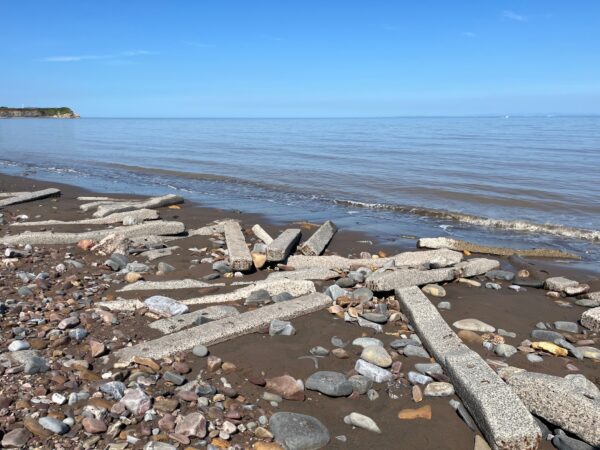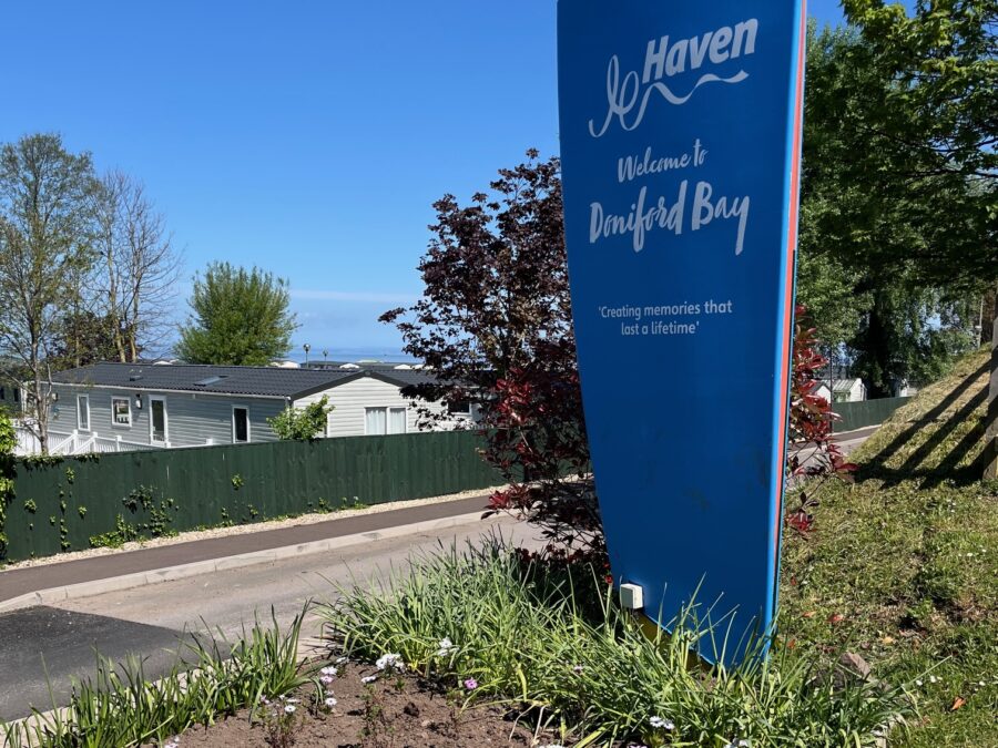 At the end of Helwell Bay concrete railway sleepers are slumbering at the edge of the waves. We clamber up the solid ramp to the path through the field then behind Doniford Bay Haven Holiday Park.