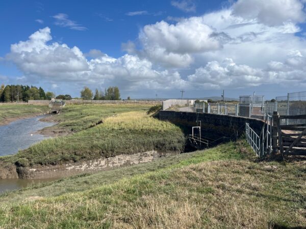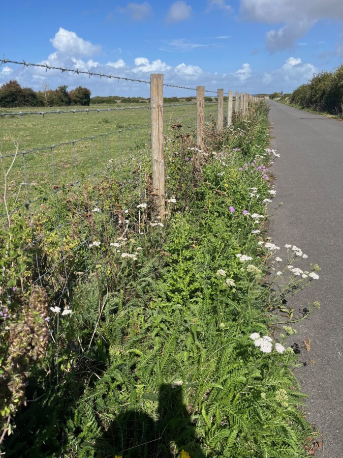 After a half hours stroll the “pier to pier” route takes a left, away from the road, through a gate onto a very long straight path, newly fenced with wild flowers growing in the verge. This is the route of the former Weston, Clevedon and Portishead Railway and the location of Wick St. Lawrence station. The “old bridge” is no longer but two new sluice bridges; Samson Sluice and Tutshill Sluice, take us over the River Yeo and its tributaries back onto the route of the railway to Tutshill Farm and back onto country lanes.