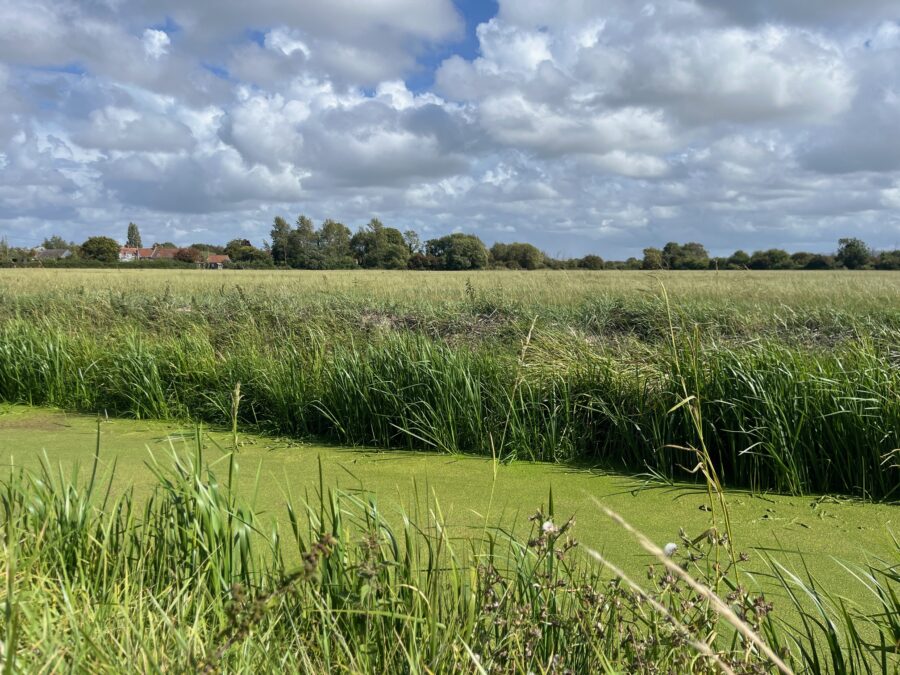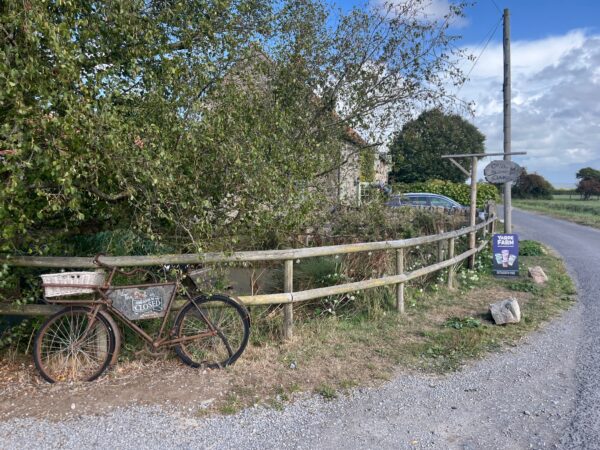 The Owl in the Park café looks like our kind of café but is sadly closed on Mondays, however, we’ve made sandwiches so find a delightful spot perched beside a narrow waterway on Yeo Bank Lane for a late lunch. We’re right beside the road, but it’s so quiet we barely notice. As we carry on take a left on Ham Lane then a right on Broadstone Lane to Middle Lane. The lanes cut through green countryside criss-crossed with waterways with fields of cattle and many more orchards.