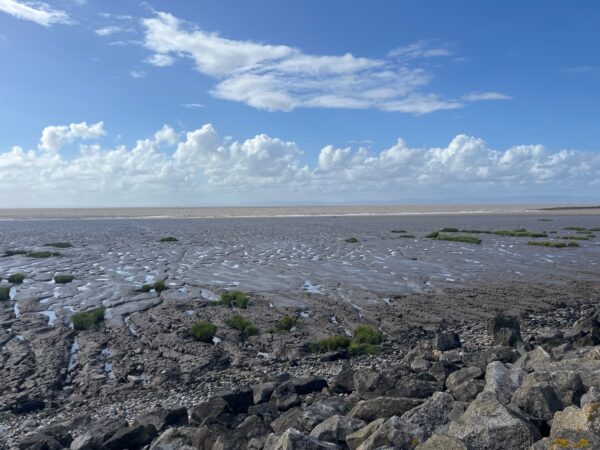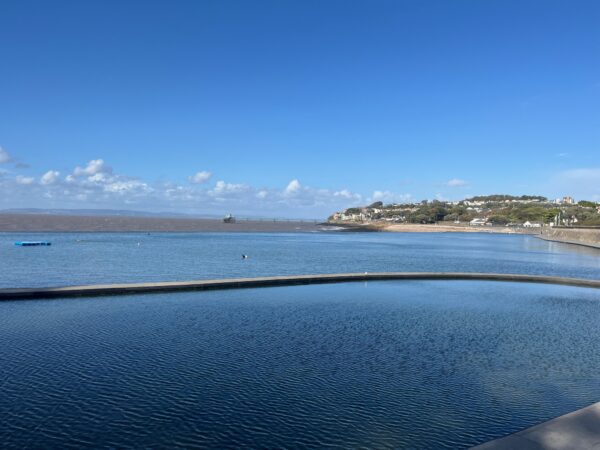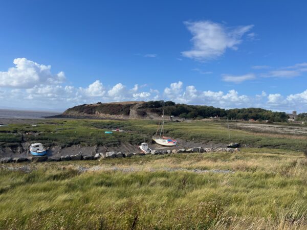 At Channel View Farm we can almost smell the sea but take a right toward Treble House Farm then a left on Back Lane towards Dowlais Farm, which, in fact is where we are staying. It’s tempting to nip to our tent but our car is parked in Clevedon town centre. It’s a short turn left and we have todays first view of the sea, well actually its kind of a muddy river estuary, but still pretty under the blue sky and puffy clouds.